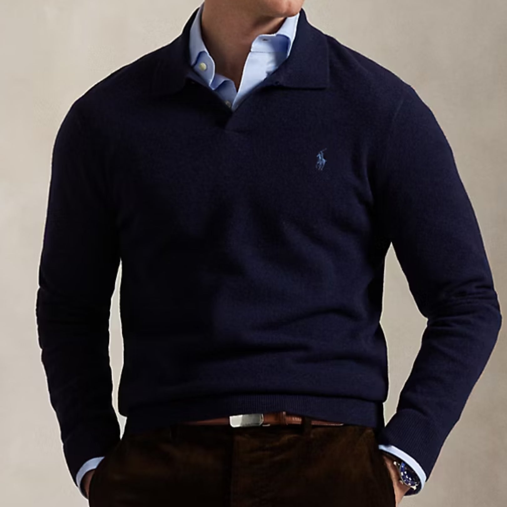 This polished sweater is finely knit with Italian wool yarn and finished with a refined embroidered chest emblem.